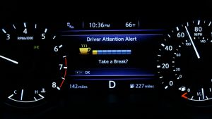 If it detects driving behavior consistent with a drowsy driver, the system uses an audible chime sound and displays an amber coffee cup with a message reading, “Take a break?” in the vehicle’s information display.