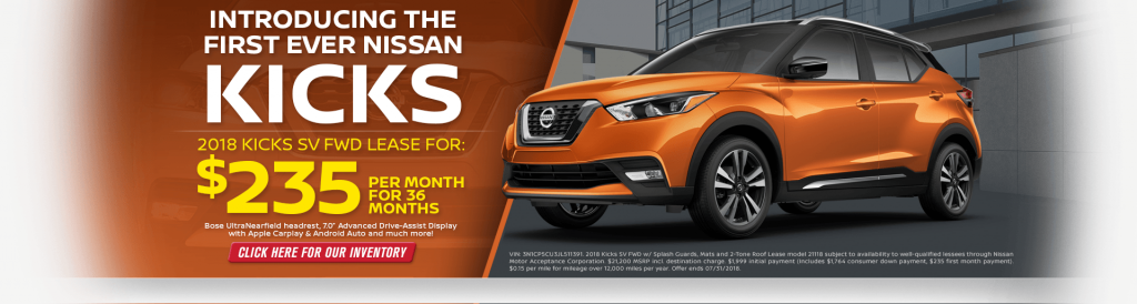 Lease the 2019 Kicks SV FWD for only $235 per month for 36 months. Click here to browse our Nissan Kick inventory.