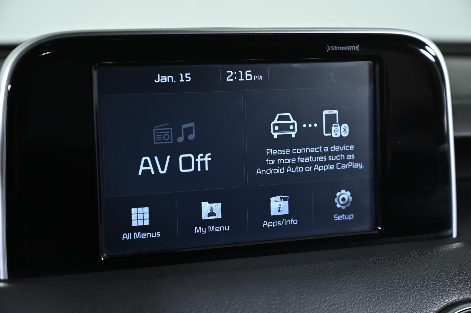 - Radio: AM/FM/MP3/HD/SiriusXM Audio System -inc: 7" color touchscreen display, 6-speakers, UVO eServices Infotainment system, Apple CarPlay, Android Auto, USB input, Bluetooth® wireless connectivity and voice recognition