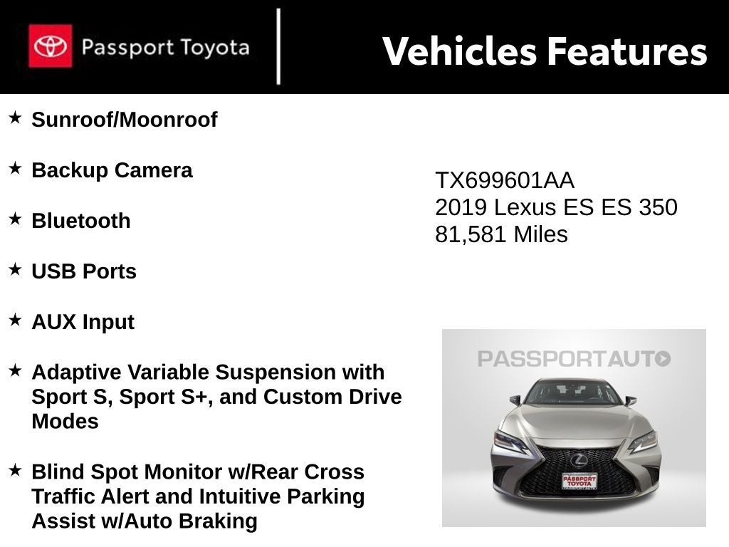 This 2019 Lexus ES 350 is a true testament to the brand's commitment to craftsmanship, technology, and performance. Experience the difference for yourself by scheduling a test drive today. We're confident you'll be captivated by its exceptional quality and refined driving dynamics.