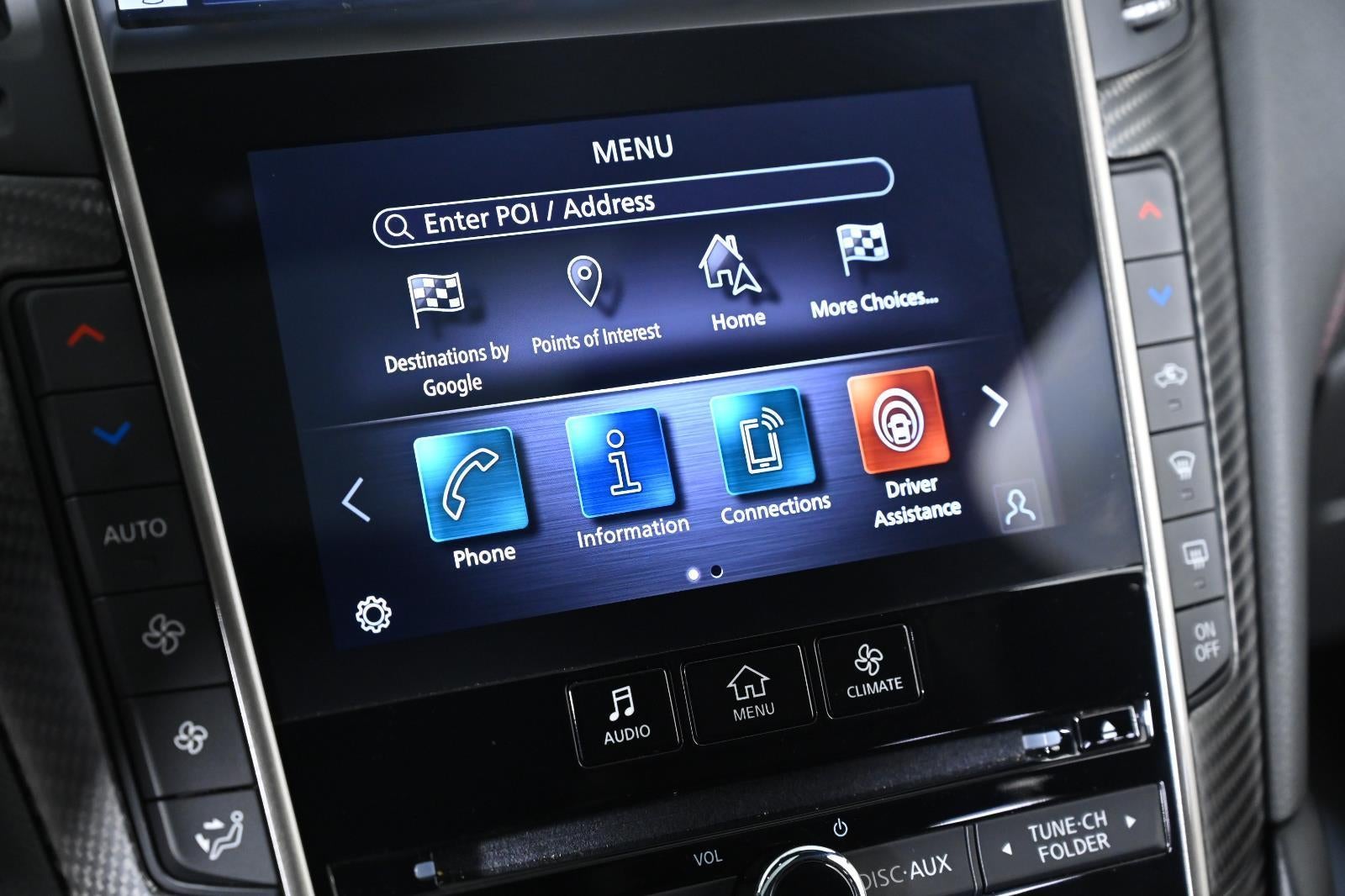 - Radio: INFINITI InTouch w/Navigation -inc: 16 speaker Bose Performance Series audio w/Bose Centerpoint simulated surround, dual HD display, navigation w/lane guidance, 3D building graphics, premium traffic and MapCare, voice recognition for navigation functions, including 1-shot voice destination entry, wireless Apple CarPlay, Siri Eyes Free, Android Auto, Bluetooth® hands-free phone system w/text messaging assistant, voice recognition for audio, Bluetooth® and vehicle information, streaming audio via Bluetooth®, 2 illuminated USB connection ports (1 type A, 1 type C), auxiliary audio input, HD Radio, SiriusXM radio w/advanced audio features w/3 month complimentary trial, SiriusXM Traffic w/3 month complimentary trial access to real-time traffic information, SiriusXM Travel Link w/3 month complimentary trial access to weather, fuel prices, stock prices, sports scores, movie listings and parking and Wi-Fi hotspot